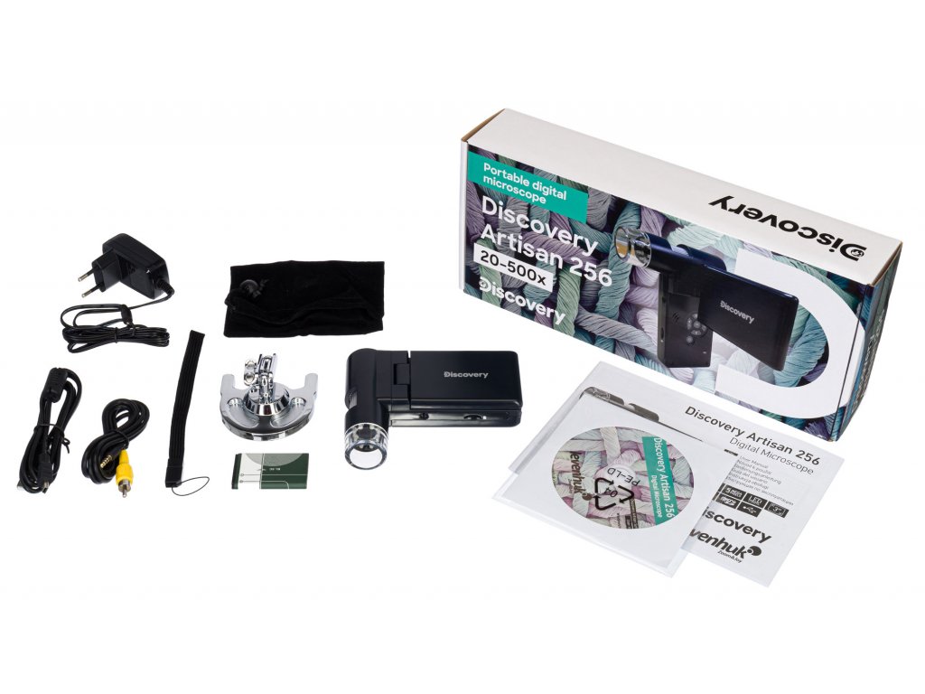 Mikroskop Discovery Artisan 256 je přenosný digitální mikroskop s LCD obrazovkou a dobíjecí baterií, který lze použít pro celou řadu profesionálních úkolů. Může být použit pro kontrolu kvality kovů, pájení, opravu elektroniky a hodin. Kromě toho jej lze použít pro hodnocení kvality šperků a uměleckých předmětů, prohlížení struktury kamenů, mincí a další účely. Přenosný mikroskop je často používán ke kontrole kvality zboží v obchodech a detekci růstu nežádoucích životních forem na ovoci a zelenině. Mikroskop je uživatelsky přívětivý. Lze jej připojit k počítači (podporuje operační systémy Windows a Mac OS) nebo k televizoru, umožňuje také pořizovat snímky, nahrávat videa a měřit vzdálenosti, úhly, poloměry a plochy.